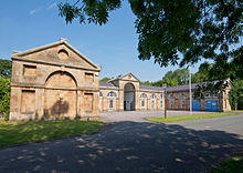 The complex of stables and kitchen gardens at Kings Weston were devised by Edward Southwell III who was already making plans whilst on the Grand Tour between 1759 and 1762. Robert Mylne was studying in Rome when Southwell visited and the pair may well have met there prior to Mylne's engagement on the detailed designs for the stable buildings in 1763. The Stables are noted in Mylne's diaries, now held in the Library of the RIBA,[24] as having been begun in 1763. The whole of the extensive matrix of kitchen gardens, stables, accommodation pavilions and a large square pond are executed to a single unified design. The stables are located on the north side of Napier Miles Road and a large glasshouse and yards were laid out either side of them. An ice house was added later.[25]