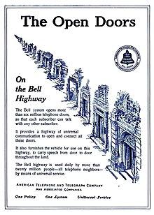 The Kingsbury Commitment is a 1913 out-of-court settlement of the United States government's antitrust challenge against the American Telephone and Telegraph Company (AT&T) for AT&T's then-growing vertical monopoly in the telephone industry. In return for the government's agreement not to pursue its case against the company as a monopolist, AT&T agreed to divest the controlling interest it had acquired in the Western Union telegraph company, and to allow non-competing independent telephone companies to interconnect with the AT&T long-distance network.[1]