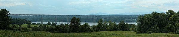 The bridge, owned by the New York State Bridge Authority (NYSBA), carries two lanes of traffic and approximately 17,000 vehicles per day. It was designed by David B. Steinman and the builders were Harris Structural Steel and Merritt-Chapman & Scott Corporation, and is the second northernmost, and second newest, of the 5 bridges that NYSBA owns and operates. The bridge has two main spans, since there is an east and west channel in the Hudson River at this point.