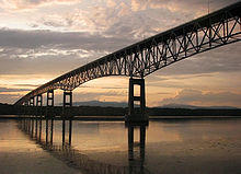 The George Clinton Kingston–Rhinecliff Bridge is a continuous under-deck truss toll bridge that carries NY 199 across the Hudson River in New York State north of the City of Kingston and the hamlet of Rhinecliff. It was opened to traffic on February 2, 1957 as a two-lane (one in each direction) bridge, although it was not actually complete. Formal opening was May 11, 1957. The original cost was $17.5 million.[1]