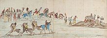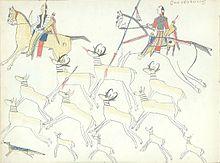 Like other plains Indians, the Kiowa had specific warrior societies. Young men who proved their bravery, skill, or displayed their worth in battle were often invited to one of the warrior societies. In addition to warfare, the societies worked to keep peace within the camps and tribe as a whole. There were six warrior societies among the Kiowa.[26] The Po-Lanh-Yope (Little Rabbits) was for boys; all young Kiowa boys were enrolled and the group served mostly social and education purposes, involving no violence or combat. The Adle-Tdow-Yope (Young Sheep), Tsain-Tanmo (Horse Headdresses), Tdien-Pei-Gah (Gourd Society), and Ton-Kon-Gah (Black Legs or Leggings), were adult warrior societies.[27][28] The Koitsenko (Qkoie-Tsain-Gah, Principal Dogs or Real Dogs)[29] consisted of the ten most elite warriors of all the Kiowa, who were elected by the members of the other four adult warrior societies.[30]