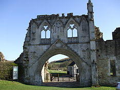The ruins of Kirkham Priory are situated on the banks of the River Derwent, at Kirkham, North Yorkshire, England. The Augustinian priory was founded in the 1120s by Walter l'Espec, lord of nearby Helmsley, who also built Rievaulx Abbey. The priory was surrendered in 8 December 1539 during the Dissolution of the Monasteries. Legend has it that Kirkham was founded in remembrance of l'Espec's only son who had died nearby as a consequence of his horse being startled by a boar. The area was later used to test the D-Day landing vehicles, and was visited by Winston Churchill.[2] The ruins are now Grade I listed and in the care of English Heritage.