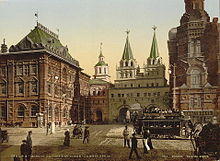 One of the most beautiful churches in Moscow, St. Nicholas Church on the Ilyinka (1680–89), informally known as the Great Cross, was a landmark in Kitay-gorod but was destroyed in 1933.[3] This district also features the Church of Cosmas and Damian and the Trinity Church of Nikitniki, which today is nestled among city buildings. It was built in the 1630s on the land of Moscow merchant, Grigory Nikitnikov.[4]