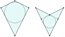 For every concave kite there exist two circles tangent to all four (possibly extended) sides: one is interior to the kite and touches the two sides opposite from the concave angle, while the other circle is exterior to the kite and touches the kite on the two edges incident to the concave angle.[11]