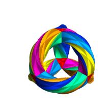Most often, the quartic is modeled either by a smooth genus 3 surface with tetrahedral symmetry (replacing the edges of a regular tetrahedron with tubes/handles yields such a shape), which have been dubbed "tetruses",[7] or by polyhedral approximations, which have been dubbed "tetroids";[7] in both cases this is an embedding of the shape in 3 dimensions. The most notable smooth model (tetrus) is the sculpture The Eightfold Way by Helaman Ferguson at the Mathematical Sciences Research Institute in Berkeley, California, made of marble and serpentine, and unveiled on November 14, 1993. The title refers to the fact that starting at any vertex of the triangulated surface and moving along any edge, if you alternately turn left and right when reaching a vertex, you always return to the original point after eight edges. The acquisition of the sculpture led in due course to the publication of a book of papers (Levy 1999), detailing properties of the quartic and containing the first English translation of Klein's paper. Polyhedral models with tetrahedral symmetry most often have convex hull a truncated tetrahedron – see (Schulte & Wills 1985) and (Scholl, Schürmann & Wills 2002) for examples and illustrations. Some of these models consist of 20 triangles or 56 triangles (abstractly, the regular skew polyhedron {3,7|,4}, with 56 faces, 84 edges, and 24 vertices), which cannot be realized as equilateral, with twists in the arms of the tetrahedron; while others have 24 heptagons – these heptagons can be taken to be planar, though non-convex,[8] and the models are more complex than the triangular ones because the complexity is reflected in the shapes of the (non-flexible) heptagonal faces, rather than in the (flexible) vertices.[2]