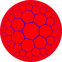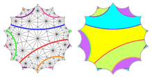 The dessin d'enfant on the Klein quartic associated with the quotient map by its automorphism group (with quotient the Riemann sphere) is precisely the 1-skeleton of the order-3 heptagonal tiling.[10] That is, the quotient map is ramified over the points 0, 1728, and ∞; dividing by 1728 yields a Belyi function (ramified at 0, 1, and ∞), where the 56 vertices (black points in dessin) lie over 0, the midpoints of the 84 edges (white points in dessin) lie over 1, and the centers of the 24 heptagons lie over infinity. The resulting dessin is a "platonic" dessin, meaning edge-transitive and "clean" (each white point has valence 2).