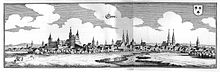 The name Kleff probably derives from Middle Dutch clef, clif 'cliff, bluff', referring to the promontory on which the Schwanenburg castle was constructed. Since the city's coat of arms displays three clover leaves (German Klee, Low German Kliev), the city's name is sometimes linked by folk etymology to the clover, but the corresponding Dutch word is klaver.[2] Notably, Kleve was spelled with a C throughout its history until spelling reforms introduced in the 1930s required that the name be spelled with a K. In 2008, the CDU announced its intention to return the name to its original spelling.