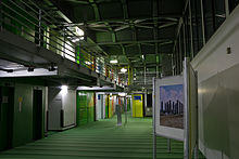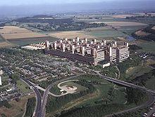 The hospital's exterior has extensive visible pipes, which give the building an industrial appearance reminiscent of an oil refinery.