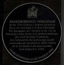There is a plaque in Market place, placed by the Knaresborough Civic Society, commemorating the 13th century Synagogue to the rear of the Market Place. The plaque indicates that in the 13th Century a Jewish community lived and worshiped in Knaresborough. The Synagogue was situated at the exit to Synagogue Lane, the exact location of which is unknown. It is believed the Knaresborough Jewish community was dissolved in 1275, before of the Jewish faith were expelled all from England in 1290.[25]