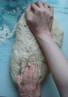 In cooking (and more specifically baking), kneading is a process in the making of bread or dough, used to mix the ingredients and add strength to the final product. Its importance lies in the mixing of flour with water; when these two ingredients are combined and kneaded, the gliadin and glutenin proteins in the flour expand and form strands of gluten, which gives bread its texture.[1] (To aid gluten production, many recipes use bread flour, which is higher in protein than all-purpose flour.) The kneading process warms and stretches these gluten strands, eventually creating a springy and elastic dough. If bread dough is not kneaded enough, it will not be able to hold the tiny pockets of gas (carbon dioxide) created by the leavening agent (such as yeast or baking powder), and will collapse, leaving a heavy and dense loaf.
