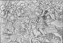 Besides formal tournaments, they were also unformalized judicial duels done by knights and squires to end various disputes.[37][38] Countries like Germany, Britain and Ireland practiced this tradition. Judicial combat were of two forms in medieval society, the feat of arms and chivalric combat.[37] The feat of arms were done to settle hostilities between two large parties and supervised by a judge. The chivalric combat was fought when one party's honor was disrespected or challenged upon in which the conflict cannot be resolved in court. Weapons were standardized and must be of the same caliber. The duel lasted until the other party was too weak to fight back and in early cases, the defeated party were then subsequently executed. Examples of these brutal duels were the judicial combat known as the Combat of the Thirty in 1351, and the trial by combat fought by Jean de Carrouges in 1386. A far more chivalric duel which became popular in the Late Middle Ages was the pas d'armes or "passage of arms". In this hastilude, a knight or a group of knights would claim a bridge, lane or city gate, and challenge other passing knights to fight or be disgraced.[39] If a lady passed unescorted, she would leave behind a glove or scarf, to be rescued and returned to her by a future knight who passed that way.