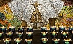 The complex incorporates five churches including the Apparition Chapel, Parish Church and Basilica, a Religious Books' Centre, Caravan and Camping Park, Knock Museum, Café le Chéile and Knock House Hotel. Services at the Shrine include organised pilgrimages, daily Masses and Confessions, Anointing of the Sick, Counselling Service, Prayer Guidance and Youth Ministry.[13] While the original church still stands, a new Apparition chapel with statues of Our Lady, St Joseph, the Lamb and St John the Evangelist, has been built next to it. Knock Basilica is a separate building showing a tapestry of the apparition.[11]
