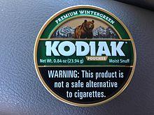 Kodiak is a brand of dipping tobacco manufactured by American Snuff Company, a U.S. smokeless tobacco manufacturer that also produces the Grizzly tobacco and Levi Garrett brands.[1] Introduced in 1980,[2] Kodiak is currently available in three flavours: Wintergreen, Mint (formerly Ice), and Straight, each featuring a picture of a Kodiak bear on the top label.[3] Kodiak recently introduced pouches, which hold the moist snuff in a tea-bag like pouch, preventing it from spreading around the mouth and keeping it out of the teeth.