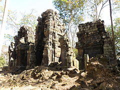 This sanctuary is the most north of this group and lies too on the west side of the street. It has two enclosures. The main entrance door (now collapsed) was itself a sanctuary with a square central room (one side measured 4 m (13 ft)). Three laterite towers (partially collapsed) stand on the same platform. In front of them are the remains of two brick libraries. The statue of the two fighting monkey kings Sugriva and Valin (figures of the Hindu epic Ramayana) was found at this site and is now in the National Museum in Phnom Penh. A fragment of a multi-armed statue of Vishnu was found in front of the tower in the middle. In this temple are five inscriptions. They mention the names of all the numerous peoples connected to the temple site and their function. [1](p33)