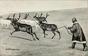 The island was explored in 1894 by the British naturalist Aubyn B.R. Trevor-Battye. He landed in June with an assistant, intending to spend about one month studying the wildlife, especially the birds. Due to mechanical problems with the vessel and a misunderstanding, they were left stranded on the island for 12 weeks. He published his study of the natural history and topography of Kolguyev as: "Ice-bound on Kolguev" (Trevor-Battye 1895). The book includes observations on the Nenets (whom he called Samoyed) who brought their reindeer to the island for summer grazing and to trap geese for trade in Russia.[3] Trevor-Battye eventually left the island with these reindeer herders in September 1894, and had to travel 1,000 miles (1,600 km) overland from the Pechora River to Archangel. He described this adventurous journey in: "A northern highway of the Tsar" (Trevor-Battye 1898).[4]