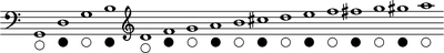 Notes available on a koncovka made in the key of G. Notes played with the end closed are marked with "●", and notes played with the end open are marked with "○".[1]