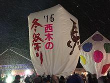 An annual sky lantern festival known as the Kamihinokinai Paper Balloon Festival (上桧木内の紙風船上げ) is held in Semboku, Akita, on February 10 each year. Hundreds of very large lanterns, known as kamifūsen (紙風船), are flown for good luck in the coming year.[4][5] Lanterns are made of washi, traditional Japanese glassine paper. The festival has mythical origins, and was suspended during World War II. It was revived in 1974.[6]