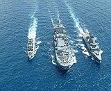 Corvette INS Kirch and fleet tanker INS Jyoti of the Indian Navy with a frigate of the Singaporean Navy during SIMBEX 2011 in the South China Sea.