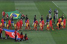 2010 was North Korea's first appearance at the World Cup since 1966.[15] The draw placed North Korea in Group G. They played their first match against five-time winners Brazil on 15 June. Despite playing close, they were nevertheless outmatched and lost 1–2. In their next game against Portugal on 21 June, they were defeated 0–7. Despite starting well (as against Brazil), their defensive and well organised approach unravelled after Portugal scored on them. The Koreans lost their final match against Ivory Coast 0–3 on 25 June. Having lost all three group matches, they were knocked out, finishing at the bottom of Group G. It was reported that the small contingency of apparent North Korean football fans were actually Chinese people who bought tickets reserved for North Korean government officials.[16] North Korea subsequently denied the report, and claimed instead that the Chinese were small in number, and that the regime had permitted their travel.[17]