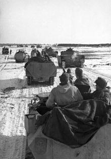 The Soviet attack started on 24 January when Konev's 2nd Ukrainian Front attacked the salient from the southeast. A breakthrough was quickly achieved, and the penetration was exploited by the 5th Guards Tank Army and the 5th Guards Cavalry Corps the following day.[25] Despite the awareness of the German 8th Army's staff that an attack was imminent, they were surprised by the appearance of the 1st Ukrainian Front's newly formed 6th Tank Army.[26] The 6th Tank Army, with 160 tanks and 50 self-propelled guns,[27] was inexperienced and took longer than expected to penetrate the western flank of the salient. A "mobile group" from the 5th Mechanized Corps' 233rd Tank Brigade, under the command of General Savelev, with 50 tanks and 200 sub-machine gun armed infantrymen, occupied Lysyanka and moved into the outskirts of Zvenyhorodka by 28 January. Here, these troops of the 6th Tank Army met the 2nd Ukrainian Front's 20th Tank Corps. Over the next three days, the two tank armies formed a thinly manned outer ring around what was now the Korsun Pocket while another, inner, ring was formed by the Soviet 27th, 52nd, and 4th Guard Armies.[28]