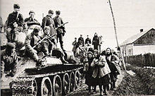 General Konev, now aware of the German breakout, resolved to keep his promise to Stalin not to let the German forces escape. Soviet intelligence, however, at this stage vastly overestimated the armored strength of the III Panzer Corps, and Konev therefore proceeded in force. At this time, the 20th Tank Corps brought its brigade of the new Joseph Stalin-2s to the Korsun battlefield.[63] Konev ordered all available armor and artillery to attack the escaping units, cut them into isolated groups and then destroy them piecemeal.[64] The two blocking Soviet rifle divisions, the 206th Rifle and 5th Guards Airborne, had been smashed by the German assault forces; without infantry support Soviet tanks then fired into the German formations from a distance. With no anti-tank weapons in the field, T-34s commenced to wade into support troops, headquarters units, stragglers and Red-Cross identified medical columns.[65][66]