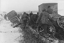 By mid-day, the majority of the now intermingled divisions had reached the Gniloy Tikich stream, 15 meter wide and two meters deep due to melting snow.[31] Despite the fact that the 1st Panzer Division had captured a bridge and engineers had erected another, the panicking men saw the river as their only escape. Since the main body was away and south of the bridgeheads, the last tanks, trucks and wagons were driven into the water, trees were felled to form makeshift bridges and the troops floundered across, with hundreds of men drowning, being swept downstream with horses and military debris. Many others succumbed to shock or hypothermia.[67] Toward the end phase of the breakout, engineers had built several more bridges and rear guard units of the 57th and 88th Infantry Divisions crossed the river "dry", including 20 horse-drawn wagons with about 600 wounded.[68]