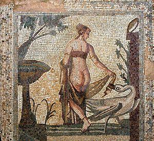 The nearby Roman villa with the outstanding mosaic of Leda and the Swan is the only one excavated so far but shows the likely richness of the city in later times (early 3rd century AD).