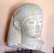 St. Andrew's University with Liverpool City Museum excavated the site of Kouklia from 1950 to 1955.[7] The so-called Siege Mound was discovered outside the walls at Marchellos and containing heavy stone balls, large numbers of weapons such as spearheads and arrows, and many architectural fragments and slabs in the Cypriot syllabic alphabet. This was thought to be a mound reported by Herodotus[8] as built by the Persians during a siege of the city in the Ionian Revolt in 498/497 BC and used as a ramp to launch projectiles inside the city. The sculptural fragments dated from the end of the Archaic period (7th–6th century BC). The most important find was the statue of the Priest-King. Also two beautiful female heads with Egyptian hairstyles were found as well as 12 statues of young men (kouroi).
