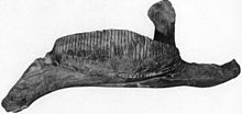 The type specimen of Kritosaurus navajovius is only represented by a partial skull and lower jaws, and associated postcranial remains.[13] The greater portion of the muzzle and upper beak are missing.[24] The length of the skull is estimated at 87 centimeters (34 in) from the tip of the upper beak to the base of the quadrate that articulates with the lower jaw at the back of the skull.[29] Potential diagnostic characteristics of Kritosaurus include a predentary (lower beak) without tooth-like crenulations, a sharp downward bend to the lower jaws near the beak, and a heavy, somewhat rectangular maxilla (upper tooth-bearing bone).[24]