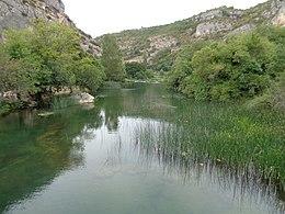 The river has its source near the border of Croatia with Bosnia and Herzegovina, at the foot of the Dinara mountain. After meandering through the Krčić canyon, it enters the karst valley of Knin through the Krčić waterfall of 25 m (82 ft). At the foot of the second, called the Topoljski waterfall, of these is a spring in a cave with 150 m (490 ft) of passage.[3] The river then flows through the valley, where it is fed by the Kosovčica on the left and the Orašnica and the Butižnica on the right, passing the Fortress of Knin between the last two on the way, and into the main canyon.
