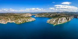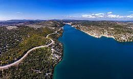 From this point on, the river is navigable from the sea. The river flows past the town of Skradin on the right, flowing into the 5 km (3.1 mi) wide Prokljansko lake, into which the Guduča river flows on the right. After that, the river empties into the 10 km (6.2 mi) long Bay of Šibenik, which is connected to the Adriatic Sea by the Canal of St. Anthony, at the Fortress of St. Nicholas.[4]