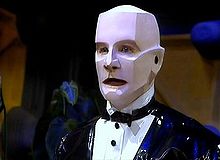 Kryten's appearance was of a mechanical-looking butler with an angular head. The head mask had provided the most problems to the make up and effects team. Prosthetic foam originally used for the mask kept falling apart and eventually a latex piece was produced.[7] Initially it had taken David Ross up to eight hours to get into the full Kryten make-up. To make matters worse, Ross suffered from claustrophobia.[8]