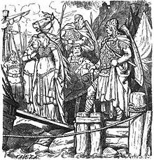 The core of this tradition is the story of Hilde's abduction and a battle on an island between her father Hagen and her abductor Hetel. This tradition is attested in Germany as early as the middle of the twelfth century, when a fierce battle on the island Wolfenwerde (in Kudrun, Wülpensand) is mentioned in Priest Lambrecht's Alexanderroman: "Hilde's father" is said to perish in the battle, and the names Hagen and Wate are given.[8] The version of events reported by Priest Lambrecht accords generally with other attestations, namely from Scandinavia, where it is known as Hjaðningavíg. Snorri Sturluson reports two versions of the tale in the Prose Edda: in one, Hildr (Hilde) attempts to mediate between her father Högni (Hagen) and Heðin (Hetel) during the battle and awakens the dead to life every night. In another, quoted from the poem Ragnarsdrápa, Hildr encourages the fight and prevents its end.[9] Another version is reported by Saxo Grammaticus. The earliest attestation of the saga appears to be a picture stone (Smiss I) from Gotland, Sweden, which shows a woman attempting to mediate between warriors on land and on a ship.[10] The saga is also attested in Anglo-Saxon England of the ninth and tenth centuries, where the poems Deor and Widsith mention the names Hagena (Hagen), Heoden (Hetel), Wada (Wate), and Heorrenda (Horant) without, however, giving any indication of their story.[8][11]