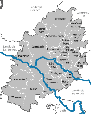 Kulmbach is a Landkreis (district) in Bavaria, Germany. It is bounded by (from the north and clockwise) the districts of Kronach, Hof, Bayreuth and Lichtenfels.