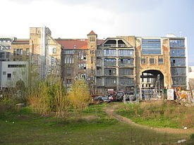 On April 4, 2011, the owner HSH Nordbank scheduled an eviction, but it was not carried out. Instead, on the next day, the "downstairs group" left the building peacefully in return for a payment of EUR 1 million from an anonymous source.[3] Eighty "upstairs" artists vowed to stay and continue to use their ateliers and metal workshops. One week later, the building's owner ordered an almost 3m tall wall to be built, separating Oranienburger Straße from the building's courtyard.[4]