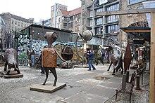 The building was painted in bright colors and a large courtyard behind the building holds several sculptures erected using rubble, debris, vehicles and other objects. It became an art center with a cafe, cinema, performance space, workshops and exhibition space.