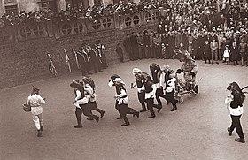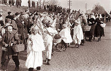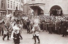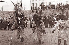 One year later, the Markovci costumes were joined by ploughmen from Lancova Vas, log-haulers from Cirkovci, and mourners from Hajdina. For the first time, carnival (non-ethnographic) groups presented themselves in the afternoon. In 1962 the event reached beyond local boundaries by inviting other carnival figures such as lavfarji (< Bavarian German Laufer 'runner'[5]) from Cerkno and borovo gostuvanje (literally, "pine wedding participants") from Predanovci in the Prekmurje region.