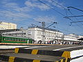 Kursky railway terminal (Russian: Ку́рский вокза́л, Kursky vokzal), also known as Moscow Kurskaya railway station (Russian: Москва́-Ку́рская, Moskva-Kurskaya), is one of the nine railway terminals in Moscow. It was built in 1896, and renovated (without major design changes) in 1938, then a large glass facade and modern roof was added in a 1972 expansion.[1] In 2008, there were plans to completely rebuild or refurbish the station.[2] Kursky station, unlike most Moscow terminals, operates two almost opposite railroad directions from Moscow: one toward Kursk, Russia, after which the station is named, that stretches on into Ukraine, and another toward Nizhniy Novgorod, which is less used by long-distance trains, and is mostly for the high-speed service to Nizhniy. Kursky is connected to the Lengradskiy Line from the other side, enabling long-distance trains from St. Petersburg going on to other cities to pass through Russia's capital. Because of its three directions, its adjacency to the city center, and its connection to three major metro lines, Kursky is one of Moscow's busiest railway stations.