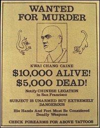 At first, Caine tried to flee to Tibet but was unsuccessful. He then escaped to the American Old West and in the first-season episode "Dark Angel" discovered from his grandfather Henry Caine (Dean Jagger) that he had a half-brother named Daniel. While he searched for Danny, he was on the run from a steady stream of bounty hunters and Chinese agents, some of whom were also Shaolin priests like himself, searching for him. In the pilot episode when another priest arrived to take him into custody, telling Caine that he had been searching for him for many weeks and that it had long been known he had fled to the US, Caine said to him, "For money? A Shaolin monk does not sell himself for a handful of rice." The monk's reply was, "You are more than a handful of rice" (the price placed on Caine's head by the Imperial government being $10,000 alive, $5,000 dead). Caine's gi was seen as gold with a red belt and the symbol of an open hand on the back (indicating that he is a master of all five forms), while his opponent's was black with a maroon belt and the symbol of a snake on the back. In the ensuing fight, Caine killed the monk.