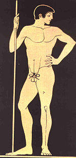 The kynodesme was worn temporarily while in public and could be taken off and put back on at will. It could either be attached to a waist band to expose the scrotum, or tied to the base of the penis so that the penis appeared to curl upwards. The public exposure of the penis head was regarded by the Greeks as dishonourable and shameful, something only seen in slaves and barbarians.[1] Modesty and decency demanded that men who showed themselves naked in a public setting, such as athletes or actors, must conceal their glans.[1][2]