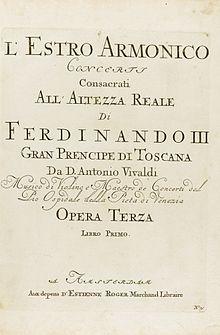 L'estro armonico (the harmonic inspiration) was published as Antonio Vivaldi's Op. 3 in Amsterdam in 1711. Vivaldi's Opp. 1 and 2 had only contained sonatas, thus L'estro armonico was his first collection of concertos appearing in print. It was also the first time Vivaldi chose a foreign publisher, Estienne Roger, instead of an Italian one. Vivaldi composed a few concertos specifically for L'estro armonico, while other concertos of the set had been composed at an earlier date.[1][2]