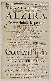 There were numerous arrangements for keyboard instruments in the eighteenth century, as described in the next section. One surviving eighteenth century transcription of Op.3, No.3 has been interpreted as an arrangement for glockenspiel. Themes from movements in the concertos were borrowed by other composers for vocal works: the opening themes from the last movement of Op.3, No.11 were borrowed by Bach for the first choral movement in his 1714 cantata Ich hatte viel Bekümmernis, BWV 21; and the opening motif of the first movement of the fifth concerto is quoted by Handel in the aria Tho' the honours in his 1750 oratorio Theodora. The most substantial borrowing occurred in the burletta The Golden Pippin, first performed in 1773 at the Theatre Royal, Covent Garden, with the music of various composers arranged by John Abraham Fisher. The first movement of the fifth concerto was arranged for the final number, a sextet for the principal characters, Jupiter, Juno, Pallas, Venus, Paris and the Dragon.[11]