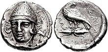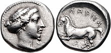 When Larissa ceased minting the federal coins it shared with other Thessalian towns and adopted its own coinage in the late 5th century BC, it chose local types for its coins. The obverse depicted the nymph of the local spring, Larissa, for whom the town was named; probably the choice was inspired by the famous coins of Kimon depicting the Syracusan nymph Arethusa. The reverse depicted a horse in various poses. The horse was an appropriate symbol of Thessaly, a land of plains, which was well known for its horses. Usually there is a male figure; he should perhaps be seen as the eponymous hero of the Thessalians, Thessalos, who is probably also to be identified on many of the earlier, federal coins of Thessaly.