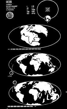 LAGEOS-1 (which is predicted to re-enter the atmosphere in 8.4 million years[6]) also contains a plaque designed by Carl Sagan to indicate to future humanity when LAGEOS-1 was launched. The plaque includes the numbers 1 to 10 in binary. In the upper right is a diagram of the Earth orbiting the Sun, with a binary number 1 indicating one revolution, equaling one year. It then shows 268435456 (in binary; 228) years in the past, indicated by a left arrow and the arrangement of the Earth's continents at that time. The present arrangement of the Earth's continents is indicated with a 0 and both forward and backward arrows. Then the estimated arrangement of the continents in 8.4 million years with a right facing arrow and 8388608 in binary (223). LAGEOS itself is shown at launch on the 0 year, and falling to the Earth in the 8.4 million year diagram.[9][10]