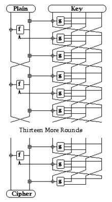 Like DES, LOKI97 is a 16-round Feistel cipher, and like other AES candidates, has a 128-bit block size and a choice of a 128-, 192- or 256-bit key length. It uses 16 rounds of a balanced Feistel network to process the input data blocks (see diagram right). The complex round function f incorporates two substitution-permutation layers in each round. The key schedule is also a Feistel structure – an unbalanced one unlike the main network — but using the same F-function.