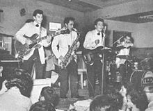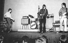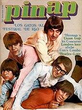 By 1964, after The Beatles' performances in the United States, Beatlemania also reached Argentina, generating the appearance of several bands that imitated their sound and fashion. Local groups began to move away from the American and Mexican rock 'n' roll model in favour of a Beatlesque style and, gradually, Spanish-language songs. Billy Bond's band Los Guantes Negros, continuation of the Bobby Cats, is an example of this transition, featuring a new name and lyrics in Spanish and a sound inspired by the Beatles.[5] However, the most successful band in using Beatles aesthetics were the Uruguayan Los Shakers, who were formed in 1963 and arrived to Buenos Aires two years later. Along with Los Mockers, they were part of the Uruguayan Invasion, a wave of bands from the neighboring country to find success in Argentina. They emerged as one of the first genuine rock products from the Río de la Plata, performing their own compositions. Although their decision to sing only in English prevented their popularity from extending beyond the decade, Los Shakers had a decisive influence so that rock music began to be produced in Argentina.[4][7][10] Hugo Fattoruso of Los Shakers later stated: "It never occurred to us that we could make lyrics in Spanish. That was an Argentine invention."[11] The TV show Escala musical "monopolized the whole beat music movement."[12] It became the only program in the region to feature obscure local bands, and helped popularize the South American garage rock movement that had emerged in response to the Beatles, among them Los Gatos Salvajes, Los Larkins (predecessor of Almendra), and the Uruguayan Invasion bands. These groups could not find their place in El club del clan, which focused on a much more "sweetened and light" style than the new rock that emerged from London and the United States.[13][14]