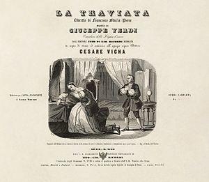 Francesco Maria Piave was engaged to write the new libretto and the two men tried to come up with a suitable subject, but the composer complained that his librettist "had not yet offered him an 'original' or 'provocative' idea". Writing to Piave, he added that "I don't want any of those everyday subjects that one can find by the hundreds."[7] But at the same time, the composer expressed concern about censorship in Venice, something with which he was very familiar after his dealings with the censors concerning Rigoletto. As the months dragged on into October, it was agreed that Piave would come to Sant'Agata (Verdi's home near Busseto) and work with the composer. One subject was chosen, Piave set to work, and then Verdi threw in another idea, which may have been La traviata. However, within a short time, a synopsis was dispatched to Venice under the title of Amore e morte (Love and Death).[8] However, as Budden reveals, Verdi writes to his friend De Sanctis telling him that "for Venice I'm doing La Dame aux camélias which will probably be called La traviata. A subject for our own age."[9] Although still bogged down at Sant'Agata, Piave was sanguine: "Everything will turn out fine, and we'll have a new masterpiece from this true wizard of modern harmonies".[10]