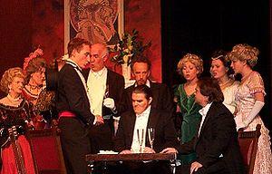 Baron Douphol, Violetta's current lover, waits nearby to escort her to the salon; once there, the Baron is asked to give a toast, but refuses, and the crowd turns to Alfredo, who agrees to sing a brindisi – a drinking song (Alfredo, Violetta, chorus: Libiamo ne' lieti calici – "Let's drink from the joyful cups").