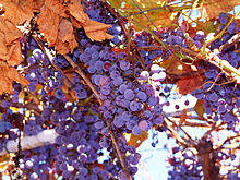 Vitis labrusca, the fox grape, is a species of grapevines belonging to the Vitis genus in the flowering plant family Vitaceae. The vines are native to eastern North America and are the source of many grape cultivars, including Catawba, Concord, Delaware, Isabella, Niagara, and many hybrid grape varieties such as Agawam, Alexander and Onaka. Among the characteristics of this vine species in contrast to the European wine grape Vitis vinifera are its "slip-skin" that allows the skin of the grape berries to easily slip off when squeezed, instead of crushing the pulp, and the presence of tendrils on every node of the cane. Another contrast with European vinifera is the characteristic "foxy" musk of V. labrusca, best known to most people through the Concord grape.[1] This musk is not related to the mammalian fox, but rather to the strong, earthy aromas characteristic of the grapes that were known by early European-American settlers in the New World. The term "foxy" became a sort of catchall for the wine tasting descriptors used for these American wines that were distinct from the familiar flavors of the European viniferous wines.[2]