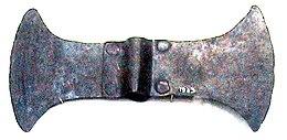 In ancient Crete, the double axe was an important sacred symbol of the supposed Minoan religion.[11] In Crete the double axe only accompanies female goddesses, never male gods. It seems that it was the symbol of the arche of the creation (Mater-arche).[12] Small versions were used as votive offerings and have been found in considerable numbers; the Arkalochori Axe is a famous example.